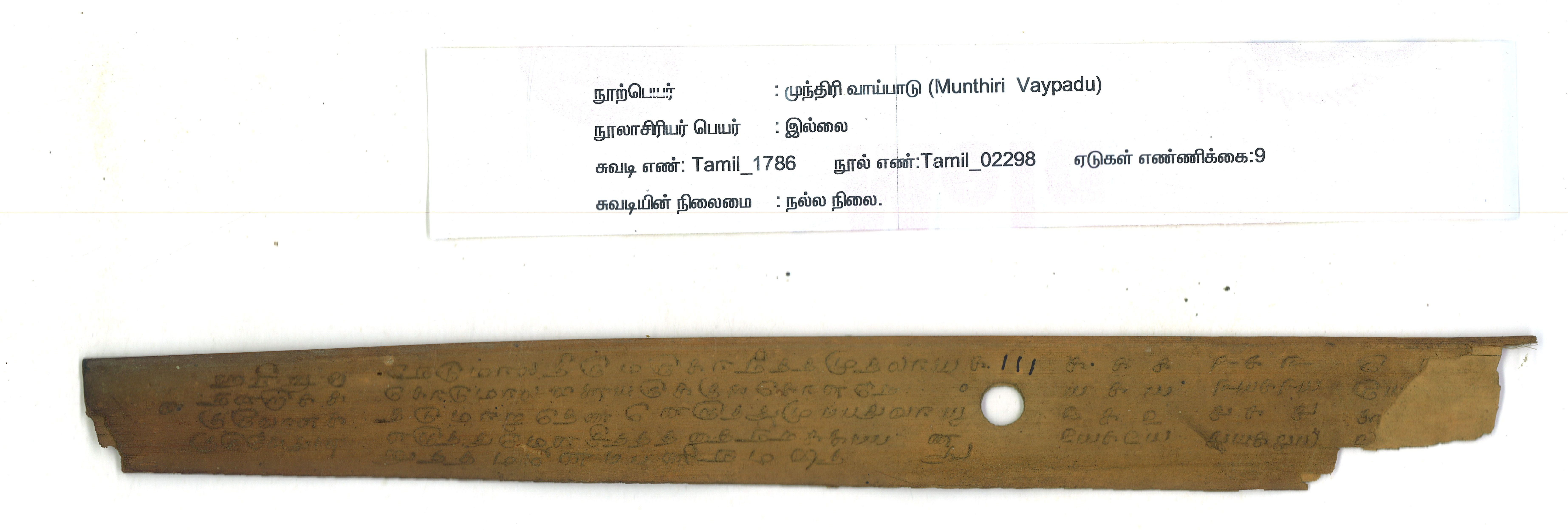 - Contains 9 leaves. Readable. Incomplete. Bad condition. 4-5 lines per page approximately. Wrongly titled as Muntiri Ilakkam. This manuscript served as a pedagogic material to the primary students.