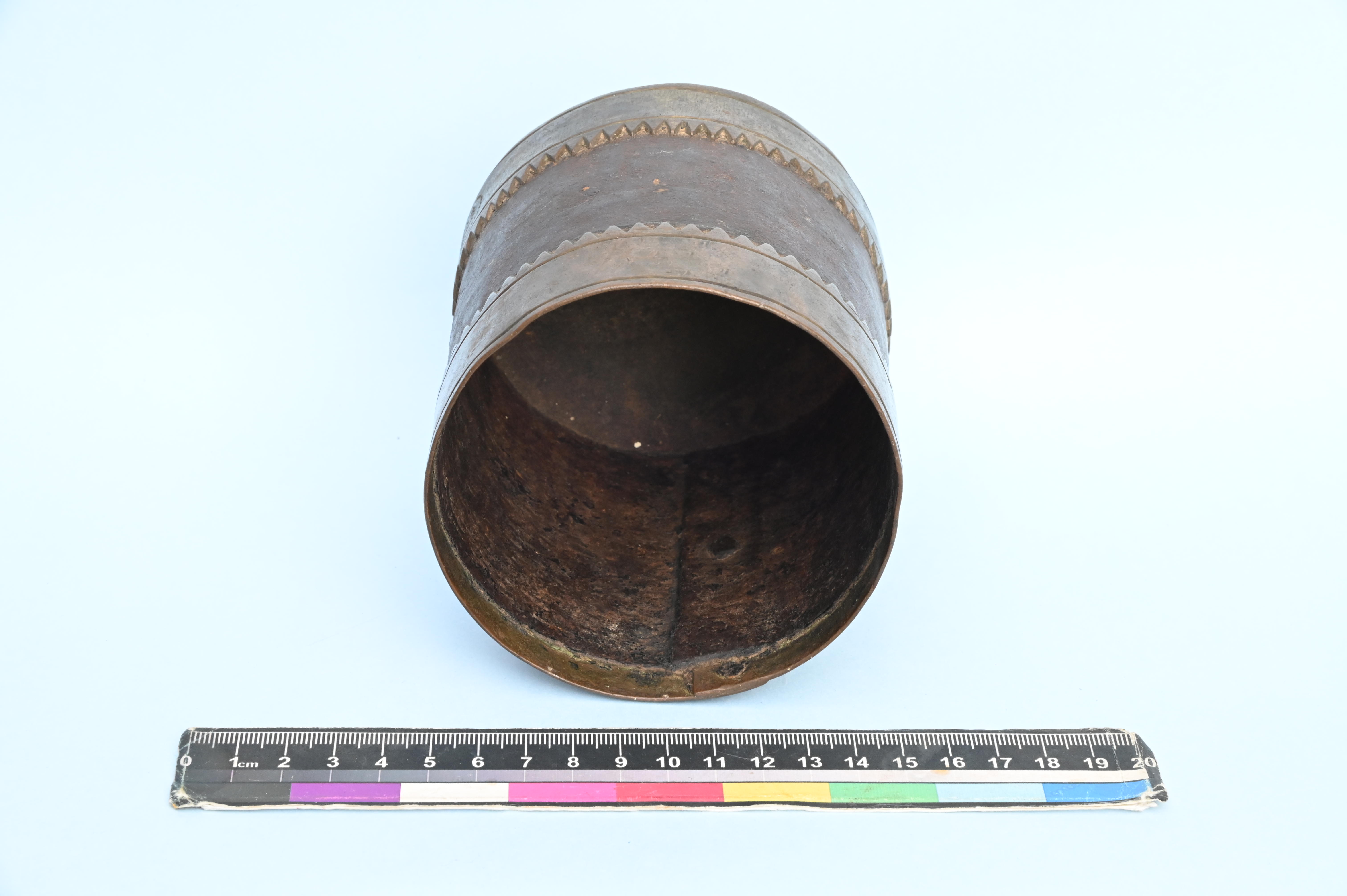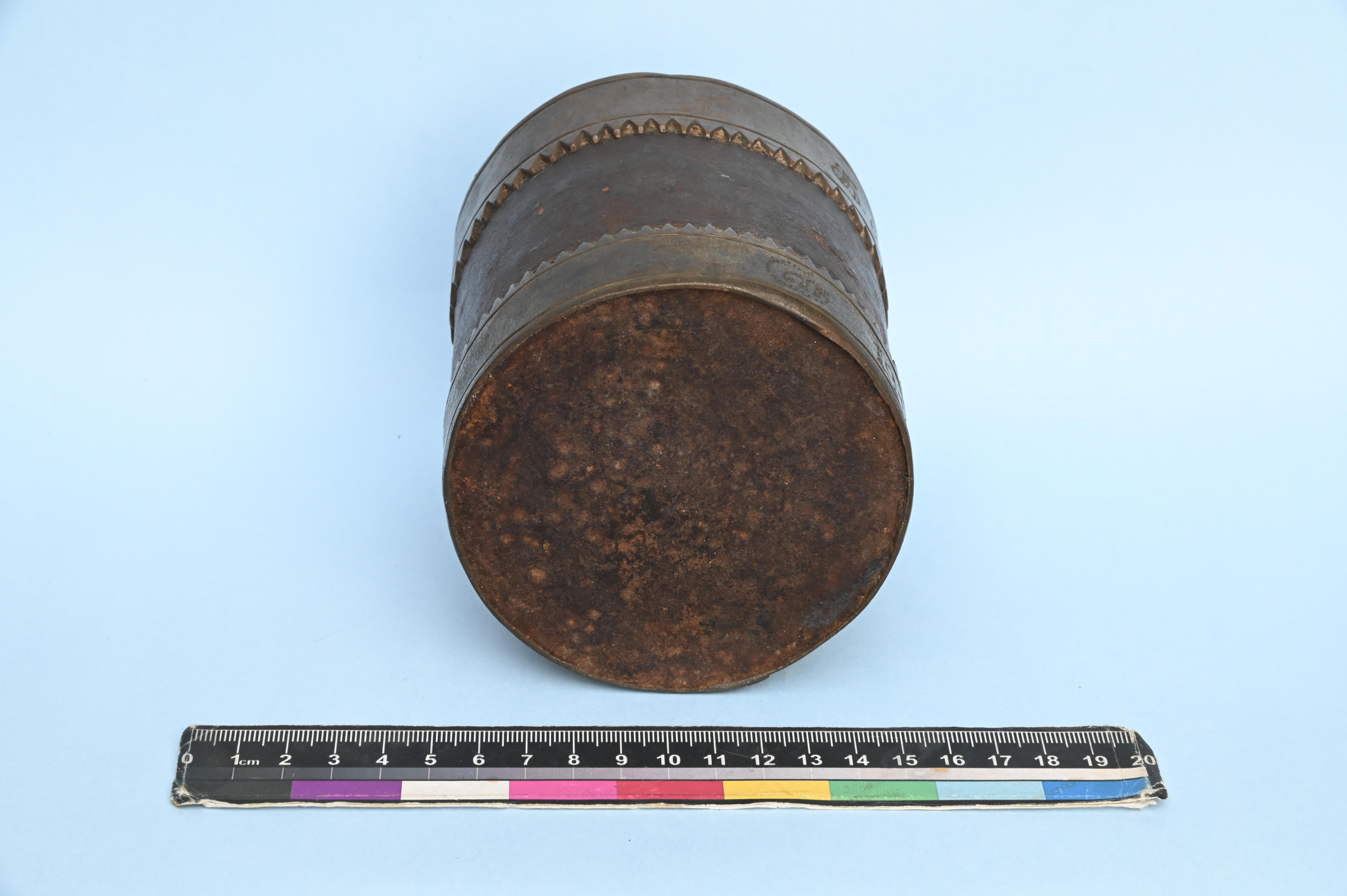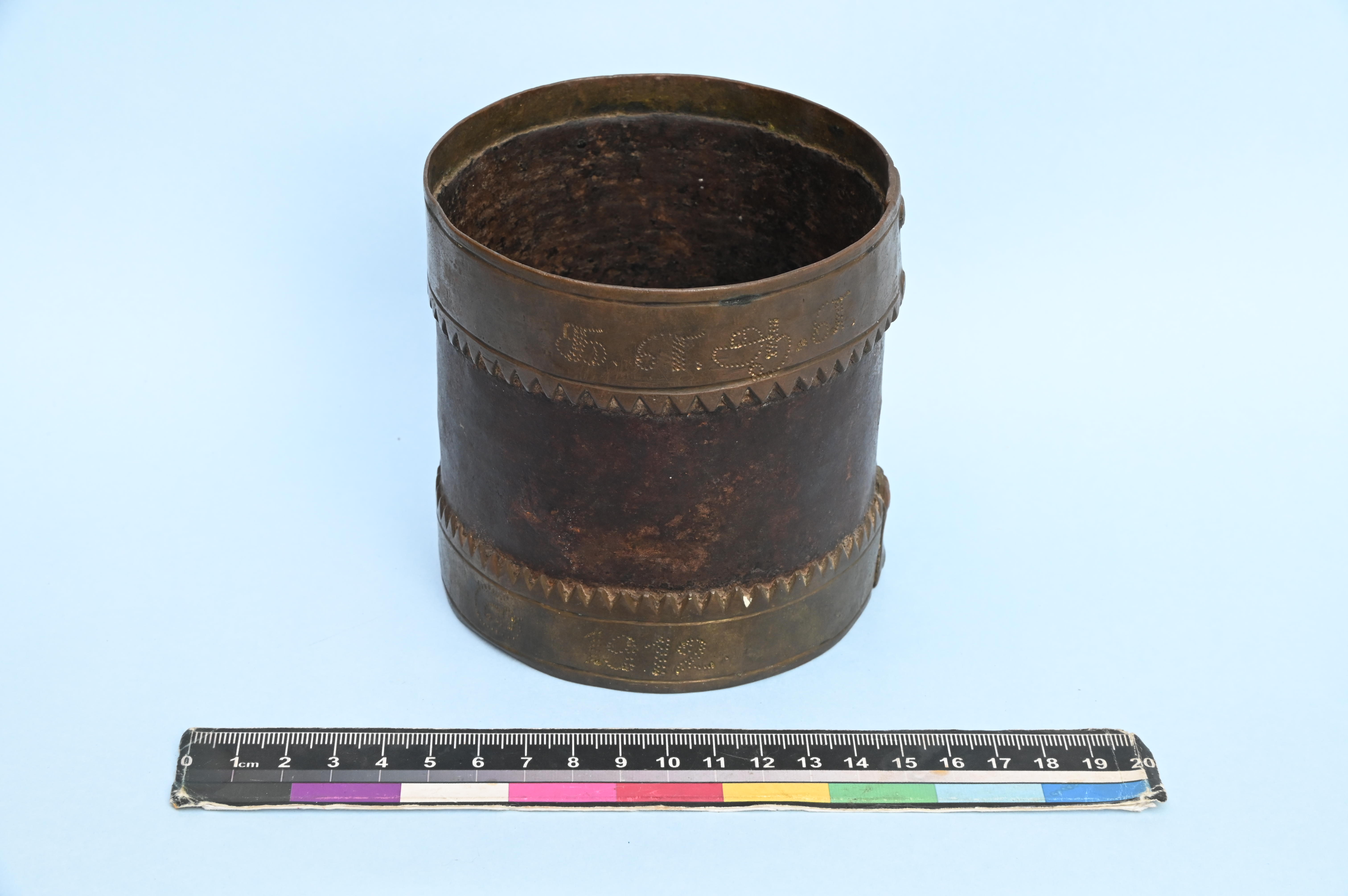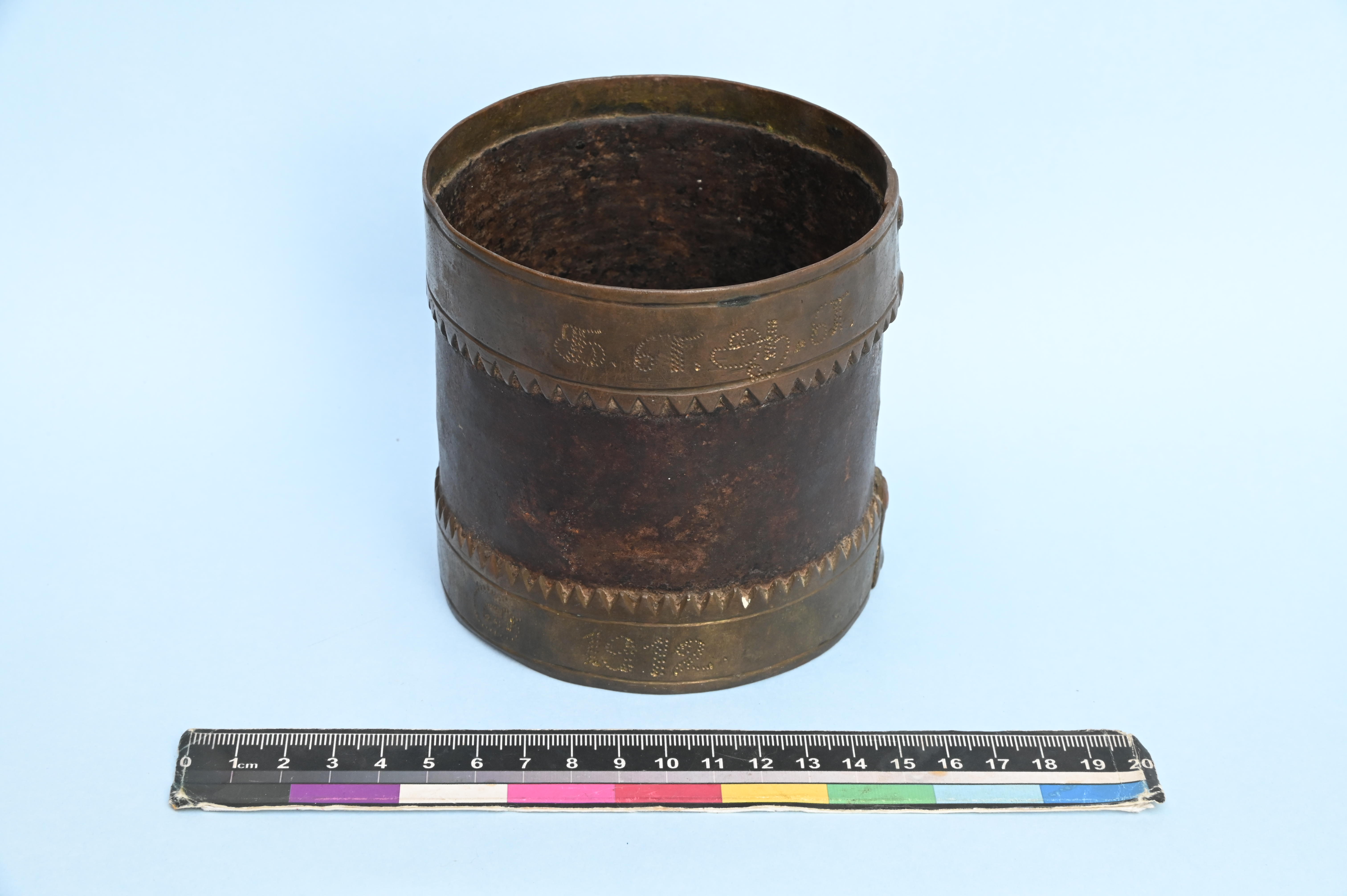 - 1912. Iron marakkal with brass work at top and bottom of the object
