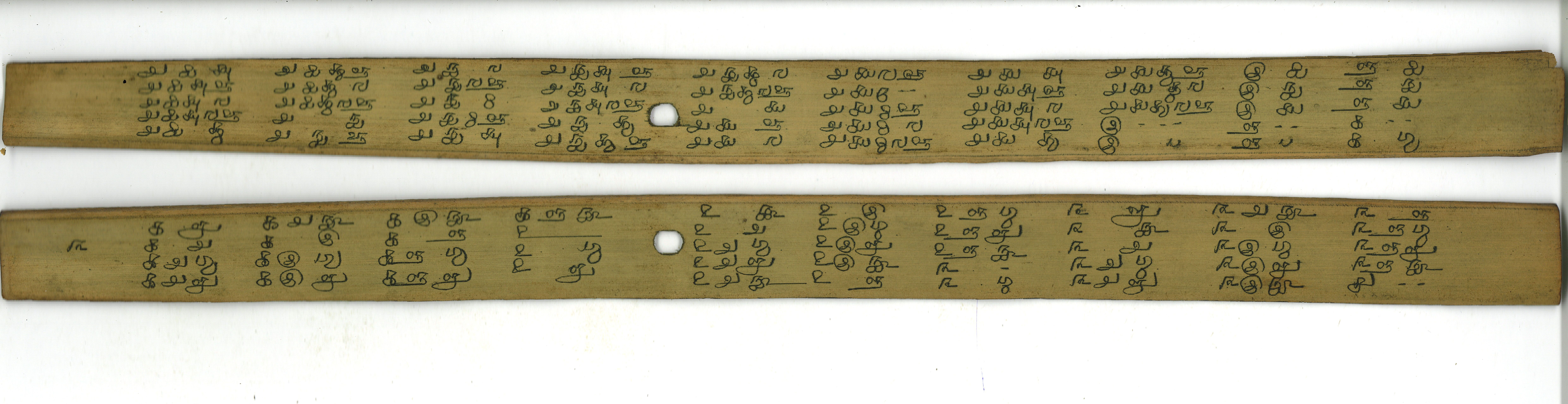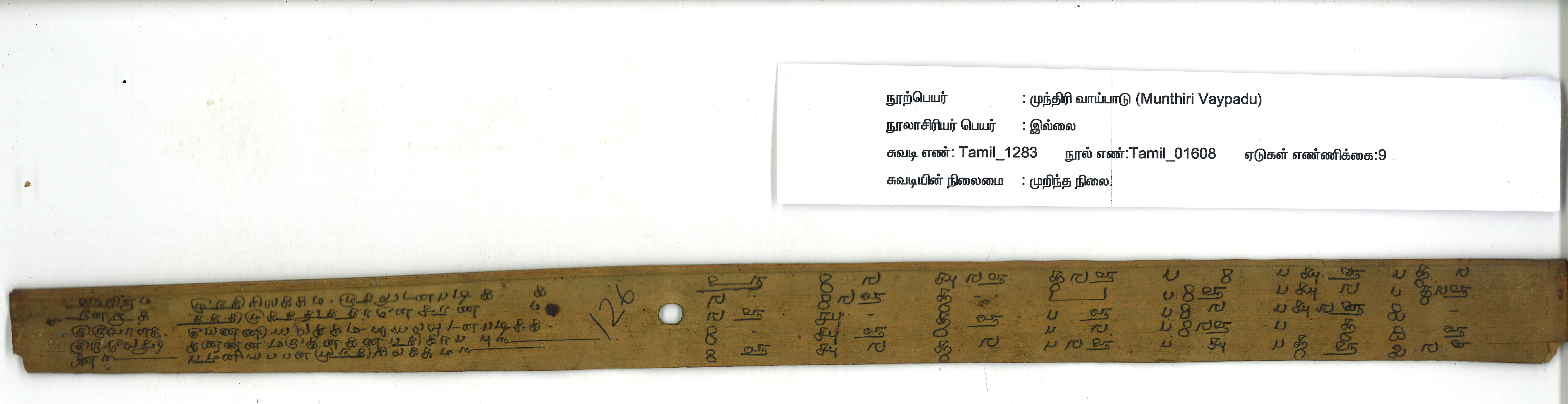 - Contains 9 leaves. Readable. Complete. 4-5 lines per page approximately. Preserved in good condition. This manuscript deals with number table from fraction to crore and has been termed as pแธปaแนiyappaแน mintirilakkam.